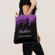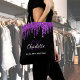 An elegant black background. Decorated with purple faux glitter drips, paint dripping look. Personalize and add your first name, monogram initials and full name. The name is written with a hand lettered style script.