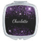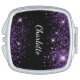 An elegant black background. Decorated with purple faux glitter dust. Personalize and add your first name, monogram initials and full name. The name is written with a hand lettered style script.