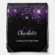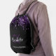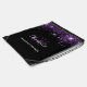 An elegant black background. Decorated with purple faux glitter dust. Personalize and add your first name, monogram initials and full name. The name is written with a hand lettered style script.
