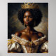 This poster features artwork of a beautiful, elegant dark-skinned queen wearing intricate, elaborate royal dress and a jeweled tiara - classic oil painting portrait style with a modern twist! This stunning woman is from the African diaspora. She has short hair styled in curls.