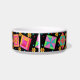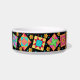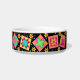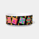 Enjoy your love of quilting when you feed your cat with this pet food dish. This quilt art combines favorite quilt pieced and appliqué patchwork blocks and unique blocks in vibrant and dynamic colors fuchsia pink, orange,turquoise, green and yellow on a black background. This design is original art from fabric designer Phyllis Dobbs. Customizable.