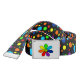 The belt has a pattern of large rainbow spots on black and the buckle has a cartoon rainbow flower.