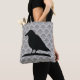 This tote bag has a silhouette of a crow bird on a grey damask pattern background.