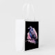 Grocery tote with an image of a black crow with purple pink wings. A pink watercolor splatter behind this lovely mystical bird.
