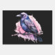 Wrapping paper sheets with an image of a black crow with purple pink wings. A pink watercolor splatter behind this lovely mystical bird.