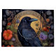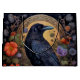 Gift bag with a black crow. A yellow arched backdrop behind. Surrounded by red and purple flowers. Cool gothic vibe.