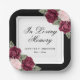 Elegant black and silver watercolor floral memorial/funeral paper plate featuring a silver frame adorned with burgundy red and pink watercolor roses and baby's breath flowers. Matching items available.