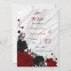 black and red flowers with gray leaves and silver glitter on a marble background save the date invitation