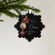 A modern black colored background. Decorated with red and gold baubles and some greenery and a pine cone. Personalize and add your name, year. Text: Merry Christmas
