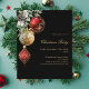 For a Christmas party with family and friends. An elegant, modern black background. Decorated with red and gold baubles and some greenery and a pine cone. Personalize and add the details.