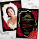 Black red gold Quinceanera celebration invitation. Features girl in ball gown dress, script font, red roses, tiara and glitter gold. Classy design with your photo on the back. Perfect for an elegant princess style glam celebration. Personalize with your own details. Printed Zazzle invitations or instant download digital printable template.