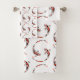 Towel set patterned with a pair of black and red koi fish swimming and circling around each other. Simple minimalist design.