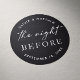 Add a classy finishing touch to your wedding rehearsal dinner with this black round sticker featuring the phrase “The Night Before”. Designed in a timeless serif font with a bold black background, this minimalist favor label is perfect for black tie, modern, or monochrome wedding themes. Ideal for sealing envelopes, party favors, welcome bags, or drinkware at your pre-wedding event.