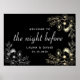 Elegant, vintage, floral, boho black The Night Before rehearsal dinner welcome poster with faux silver and gold floral lace and modern calligraphy script.