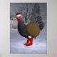 father christmas got a cute chicken as helper this year - happily dashing with red boots and hat through the snow at winter time
