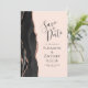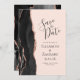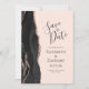 The left-hand edge of this elegant modern wedding save the date card features a black watercolor agate border trimmed with faux rose gold glitter. The customizable text combines slate black handwriting, copperplate and italic fonts on a blush pink background. The reverse side features a matching black and rose gold agate design.