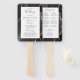 This elegant, modern wedding program fan features a black agate background trimmed with rose gold faux glitter. The text appears in elegant charcoal gray handwriting and copperplate fonts on a white rectangle.