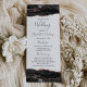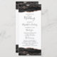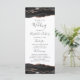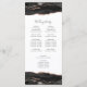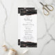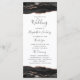 This elegant, modern wedding program features black watercolor agate top and bottom borders trimmed with rose gold faux glitter. The text appears in elegant charcoal gray handwriting and copperplate fonts on a white background.