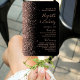 This elegant, modern wedding program fan features a black agate background trimmed with rose gold faux glitter. The text appears in elegant rose handwriting and copperplate fonts on an off-black rectangle.