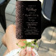 This elegant, modern wedding program fan features a black background edged with rose gold faux glitter. The text appears in elegant rose pink handwriting and copperplate fonts.