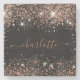A stylish black background. Decorated with rose gold faux glitter drips and glitter dust. Personalize and add a name. The name is written with a modern hand lettered style script with swashes.