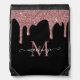 Girly Black Rose Gold Sparkle Glitter Drips Monogram Drawstring Bag Backpack with fashion faux blush pink/rose gold glitter drips on a chic black background with your custom monogram and name. Please contact us at cedarandstring@gmail.com if you need assistance with the design or matching products.