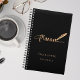 A chic black background, decorated with a feather pen. Personalize and add a name and year. Golden text: Planner