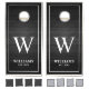 Personalized rustic style black wooden planks background cornhole set with your own custom family name, monogram and established date.