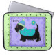Show your dog love while protecting your laptop with this laptop sleeve. Personalize with your dog's name with this unique one of a kind laptop case with a cute black terrier dog dressed for the occasion. This whimsical black Scottie Terrier is wearing a turquoise aqua or teal blue sweater coat decorated with a lavender and lime green accents. The Scottie dog is wearing a toboggan of the same colors for a turquoise and lavender stripe with dogs on the cuff. The background is lavender and purple with tonal purple snowflake accents. A lime green border with black paw prints frames the dog art. A black serpentine line border is inside the lime green border. A turquoise teal flower is above the dog. This cute, cuddly and trendy dog is original art by Phyllis Dobbs and will melt the heart of a dog lover. This Scottie is one of a series of 6 Scotties and all are fully customizable to make it your own! Coordinate with matching products.