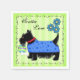 Show your scottie dog love when entertaining with this cute pape cocktail napkin with a black terrier dog and customized with the words "scottie love" that can be personalized with the dog's name or other words. Customize the words above the art image or delete if you prefer. This whimsical black Scottie Terrier is wearing a blue sweater coat with tonal blue stars and a red collar. A lime green and turquoise ball is behind the Scottie and a large white dog bone is at his or her front paw. The background is a lime green tonal stripe pattern. A serpentine line border surrounds the dog image to make a stylish, trendy and custom decorative cocktail party napkin. Three turquoise teal blue flowers are above the dog. This cute, cuddly and trendy dog is original art by Phyllis Dobbs and will melt the heart of a dog lover. This Scottie is one of a series of 6 Scotties and all are fully customizable to make it your own! Coordinate with other matching products for a great party or event.