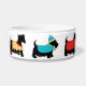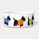 Customize this dog pet food dish to show your love of Scottish Terrier dogs and personalize with your dog's name in the center. The colorful design has 6 black Scottie dogs in a colorful array of dog clothes. These whimsy, cute and adorable Scotties are wearing various colorful dog sweater coats or tees and one has a toboggan hat. The colors are red, lavender, purple, yellow, turquoise teal blue, lime green and orange with paw prints, stars, stripes, checks, and snowflake patterns. These whimsical and trendy dogs are original art by Phyllis Dobbs and will melt the heart of a dog lover. These pet Scotties are both individually and on colorful blocks with borders for coordinating products. All are fully customizable to make it your own!