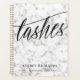Chic spiral planner or appointment book for a lash artist with lashes written in a black script across a marble background in white and gray. Add your name in elegant black letters.