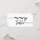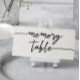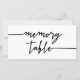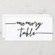 White memory table card for a funeral or memorial service in a white and black design with a bold script. White memory table card with a black script.