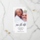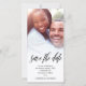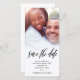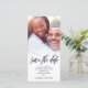 Save the date photo card personalized with your own romantic photo. Save the date written in a gorgeous black script above your wedding date and additional info for your future wedding guests. The edge between wedding photo and text is softened with a white gradient. Add your names too!