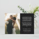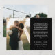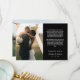 Romantic wedding thank you card printed with two of your wedding photos, a smaller one on one side and a larger on the other side. Thank you and your wedding date written in a neat white font with your names in a romantic script with a printed thank you text above on a black background.