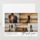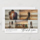 Say thank you to your wedding guests with a photo collage card where you can feature five of your own lovely wedding photos in a clean asymmetrical collage. Add your names and wedding date in a modern black font. Thank you is written in a vintage style signature script. On the back you can write by hand a personal thank you message on the faintly lined background. The perfect photo collage wedding thank you card to show off your favorite photos of the best day of your lives with your names in a modern font combined with a retro script saying thank you.