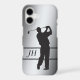 Perfect for the golf fan, this phone case features a black silhouette golfer in full swing. At the bottom is your monogram framed by double thin black lines. The text and image are placed on a light infused silver background.