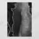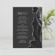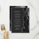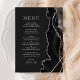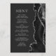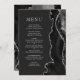 The right-hand edge of this elegant modern wedding menu features a black watercolor agate border trimmed with faux silver glitter. The customizable text combines silver gray Roman serif and copperplate fonts on an off-black background. The reverse side features a matching black and silver agate design.