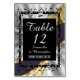 Traditional chic elegant modern sleek masculine black, silver gray and gold personalized table number with musical notes surround, on black background and swirly ribbon , personalize with your text to the templates for your special occasions or celebrations. Visit the PERSONALIZED _WEDDINGS STORE for matching products. PLEASE NOTE THE golden color, and silver pewter color is not metallic.