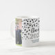 Customizable photo template class of 2025 graduation mug with black and silver confetti pattern.