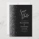 The left-hand edge of this elegant modern wedding save the date card features a silver faux glitter border. The customizable text combines silver gray handwriting, copperplate and italic fonts on a black background. The reverse side features a matching black and silver design.