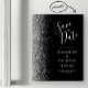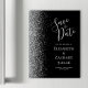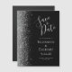 The left-hand edge of this elegant save the date magnetic card features a silver faux glitter border. The customizable text combines silver gray handwriting, copperplate and italic fonts on a black background.