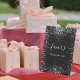 A black background color. Decorated with faux silver glitter dust. With the text: Favors, please take one!