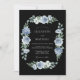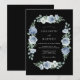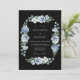 A striking midnight aesthetic defines this design, making it ideal for formal evening events or winter nuptials. The deep charcoal backdrop creates a dramatic contrast for the cool-toned palette of dusty blue, slate, and cream. Watercolor roses, lush hydrangeas, and white anemones are accented by soft greenery.