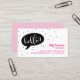 Cute business card in white, black, and hot pink with hello! written inside a black speech bubble, surrounded by little dots. Your name and contact info in hot pink. The back is a blank pale pink so you can write things by hand to your clients if needed.