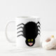 A mug featuring a spooky black spider with eight hairy legs, yellow eyes with big black pupils and its mouth open showing its fangs.