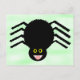 A spooky black spider with eight hairy legs, yellow eyes with big black pupils and its mouth open showing its fangs.