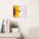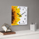 Clock with a black square clock face on a background with a yellow and brown sunflower on white. Customizable. Modern and trendy, yet classic, this clock is perfect for any decor.