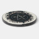 The design on the wireless charger is a dark, intricately detailed gothic emblem featuring a prominent inverted pentagram set inside a heavily shaded, metallic-looking circle. This central symbol is surrounded by a dense, circular wreath of exaggerated, stylized thorny vines and leaves in deep black and muted red-brown tones, giving it a three-dimensional, heavily textured appearance. A dark, unfurled banner or scroll arches across the very top of the circle, completing the heraldic, overtly occult aesthetic of the entire design.
