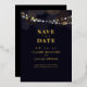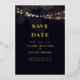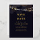 A fun and festive Save the Date featuring black background with string lights, text in Gold Foil.